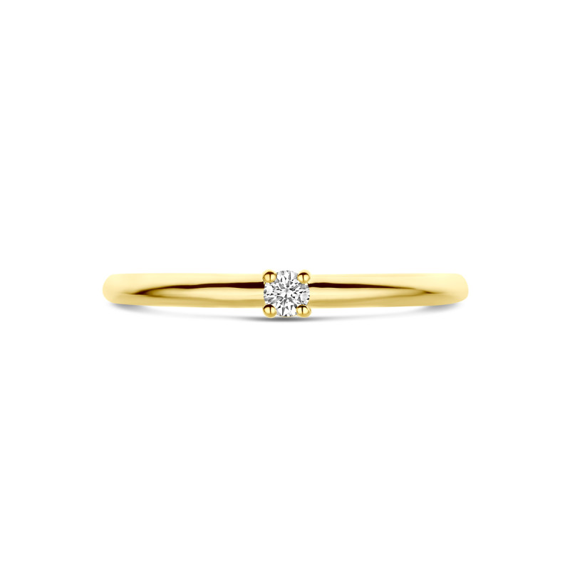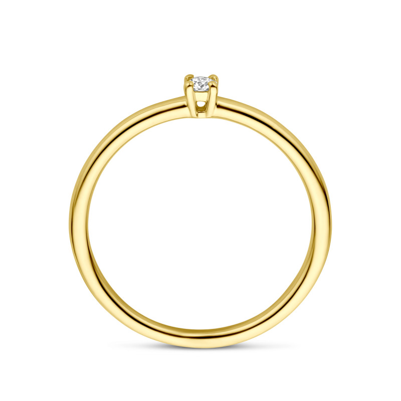 De ring heeft een gouden band en een briljant geslepen diamant van 0,05 karaat in het midden. De diamant is helder en vangt het licht mooi op. De klauwzetting houdt de steen stevig vast.