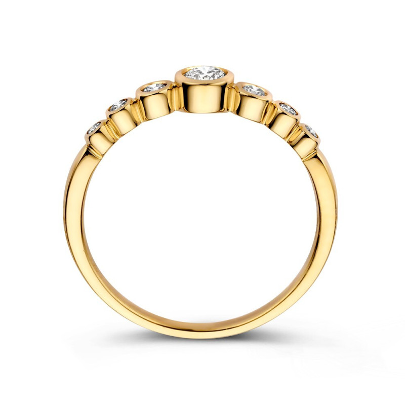 Deze schitterende ring straalt subtiele charme uit. Hij heeft stenen die groter worden langs de band, wat een interessant visueel effect creëert. De diamanten van 0.32 crt in totaal zijn geplaatst in een glanzende gouden zetting, waarbij het transparante karakter van de edelstenen mooi naar voren komt.