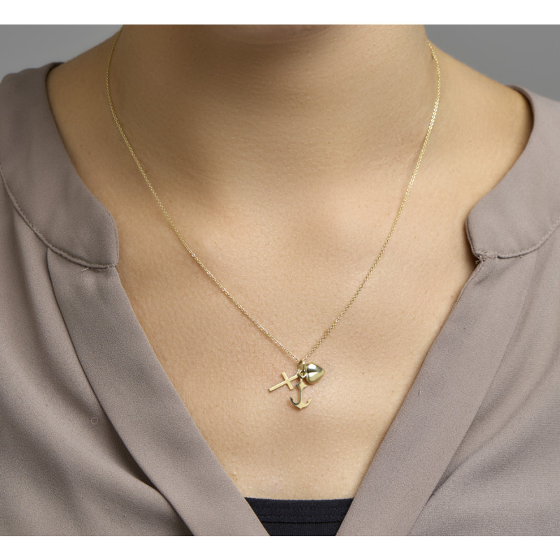 Mooie geloof, hoop en liefde hanger gemaakt van goud. Deze hanger is een prachtig sieraad om uw geloof mee uit te drukken. De hanger heeft een hoogte van 18 mm en is gemaakt van 14-karaat goud. Verkrijgbaar met of zonder gouden ketting. Levering inclusief sieradendoosje. Geschenkverpakking mogelijk.
