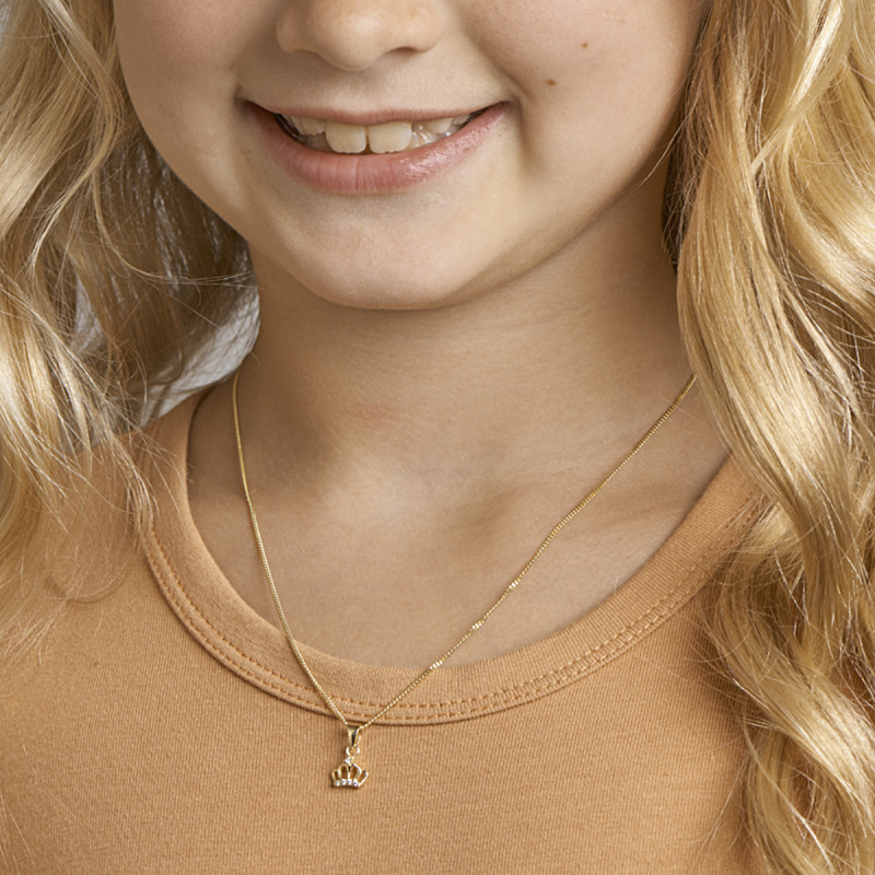 Een lief 14-karaat hangertje in de vorm van een kroon. De kroon is uitgevoerd met transparante zirkonia's en hij zit bevestigd aan een stevig hangoogje. De totale hoogte van dit hangertje is 13 mm en hij is 7.5 mm breed. Dit lieve hangertje is leuk om als cadeau te geven aan uw (klein)kind. Het hangertje wordt geleverd inclusief sieradendoosje. Een geschenkverpakking is ook mogelijk.