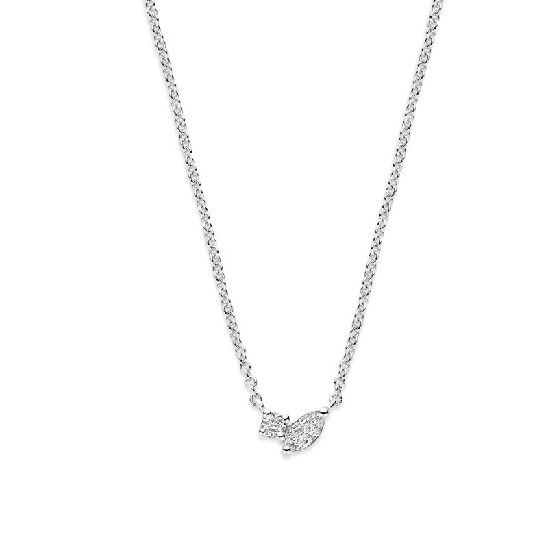 De hanger, met een afmeting van circa 5 x 7.5 mm, is het stralende middelpunt van dit collier. Gemaakt van 14-karaat witgoud, straalt het een prachtige glans uit die door de hoogwaardige afwerking extra wordt benadrukt. De diamant van 0.14 crt, met een marquise slijpvorm, voegt een vleugje luxe toe. De transparante kleur en de H-kleurgraad van de diamant zorgen voor een heldere schittering die subtiel opvalt.