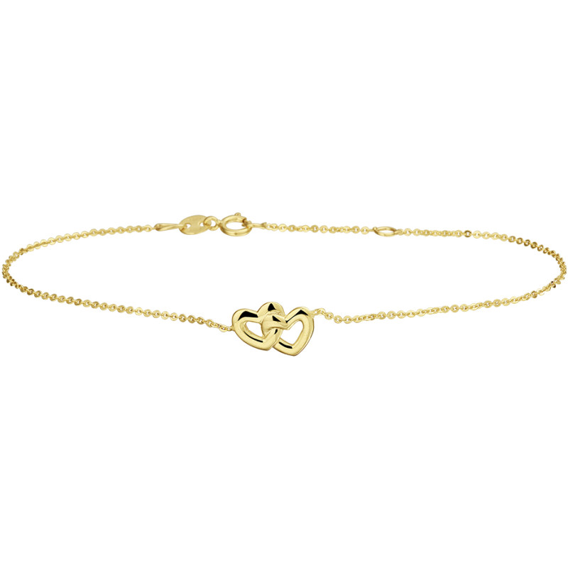 Lief gouden armbandje met twee gouden hartjes. De hartjes zijn samen circa 12.5 mm breed en 7.5 mm hoog. De armband is voorzien van een mooie smalle ankerschakel van 1 mm breed en een karabijnslot. De armband is volledig van 14-karaat goud gemaakt. De armband heeft twee draaglengtes: 16 cm en 18 cm.
