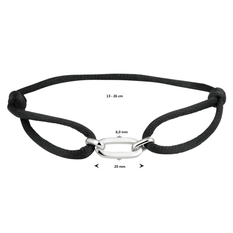Zwart gevlochten armband uitgevoerd met 925 zilveren element. De armband heeft draaglengtes van 13 tot 26cm. Het element heeft een afmeting van 20x6mm.