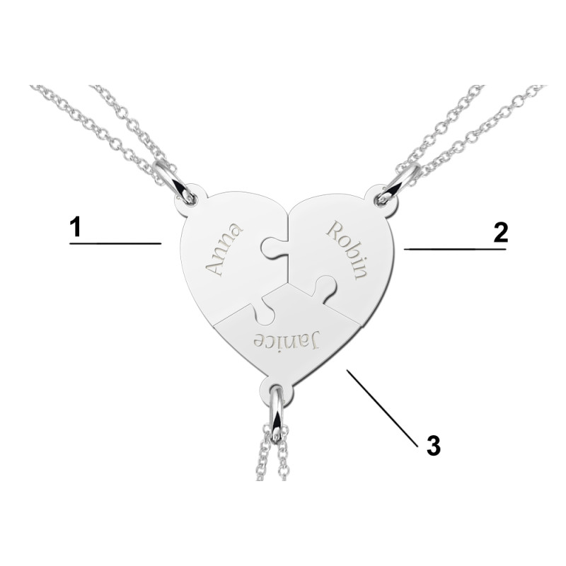 Drie zilveren naam-breekhangers het breek hart is 6-delig, 3 hangers en 3 colliers. Een set draag je dan vaak zelf en de andere geef je aan je beste vrienden en/of geliefden.