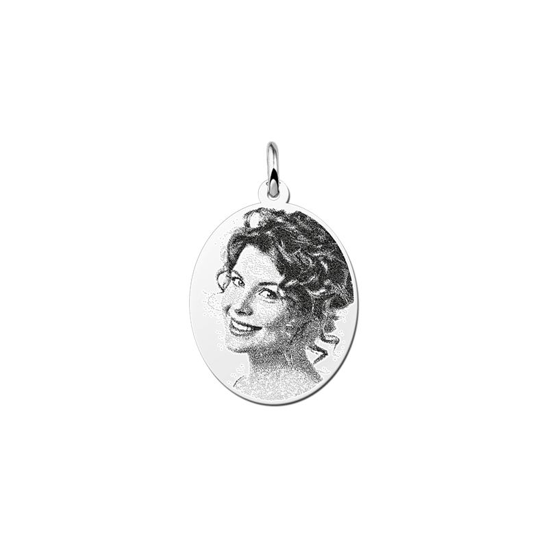 Prachtige foto ketting in ovale vorm gemaakt van de hoogste kwaliteit 925 zilver. Op de ovalen hanger graveren wij de foto die u ons aanlevert. Wij zorgen ervoor dat de foto prachtig op de zilveren hanger gegraveerd wordt. Het ovaaltje heeft een afmeting van ongeveer 19.5 bij 23.5 mm en een dikte van 0.7 mm. Eventueel is de ovalen foto ketting beschikbaar in 14 karaats goud. Bekijk daarnaast ook eens de overige beschikbare vormen zoals de ronde, rechthoekige, vierkante of hartvormige foto hangers.