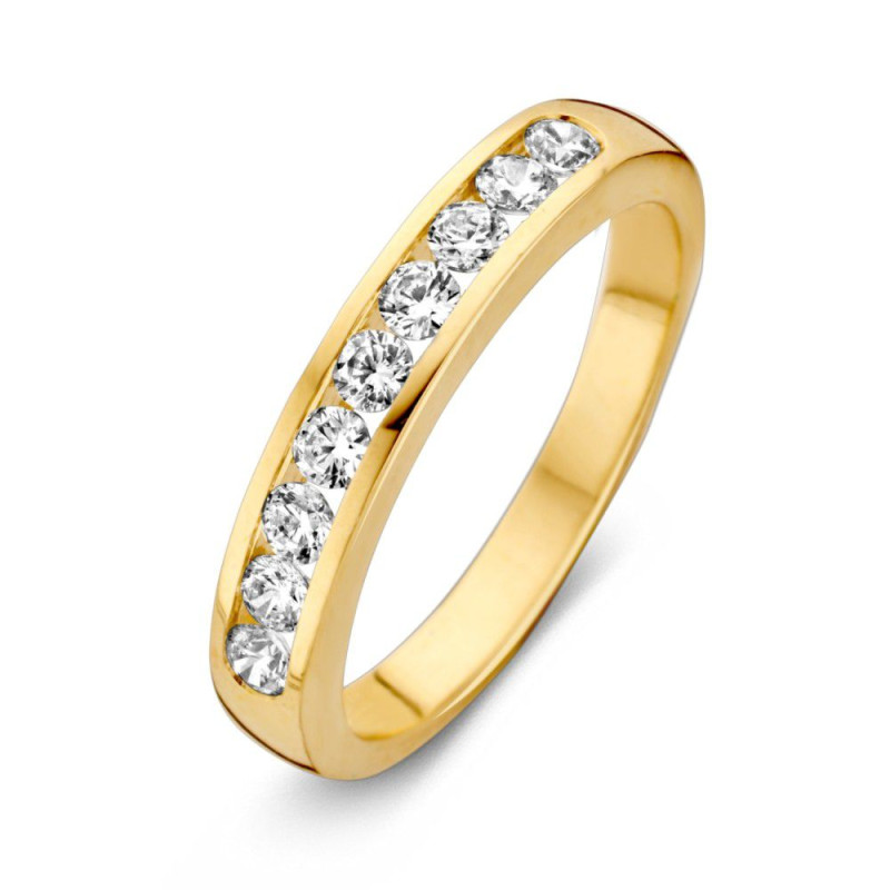 Wanneer u graag een kwaliteitsring aan uw sieradencollectie toevoegt is deze stijlvolle gouden ring met zirkonia wellicht het perfecte sieraad voor u. 14-karaat goud heeft een erg sterk en mooi goudgehalte. De ring is dan ook uit 14-karaat goud vervaardigd. Het goud heeft een mooie warme uitstraling die zowel bij andere warme kleuren zal passen als bij koele kleuren. De ring is afgewerkt met zirkonia een synthetische steen die bekend staat om de mooie kleurrijke schittering. Combineer deze ring met een van onze andere gouden sieraden. Wij verpakken deze ring in een mooi ringendoosje. Is dit sieraad een geschenk voor die bijzondere dame? Geef het aan en tegen een kleine vergoeding pakken wij dit in met mooi cadeaupapier.