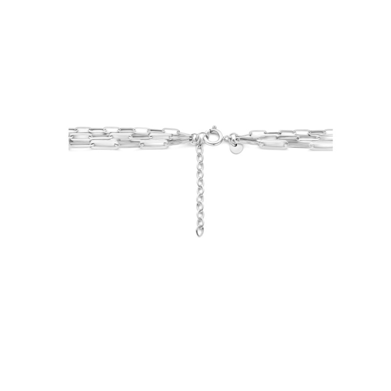Een speelse zilveren ketting welke bestaat uit drie paperclip schakelkettingen van verschillende diktes. De schakels zijn 2.8, 3.3 en 4 mm breed. Deze schitterende ketting heeft een draaglengte van 41 cm met een extensie van 4 cm. Zo is de ketting verstelbaar en op verschillende lengtes te dragen. Door de drie lagen is deze ketting uniek in zijn soort. Tevens zullen de kettinkjes niet in elkaar draaien omdat het eigenlijk één geheel is. De ketting is gemaakt van 925 serling zilver en is tevens gerhodineerd, waardoor die berschermt is tegen oxidatie. Ook verkrijgbaar in het gold plated. Wordt geleverd inclusief sieradendoosje. Een geschenkverpakking behoort ook tot de mogelijkheden.