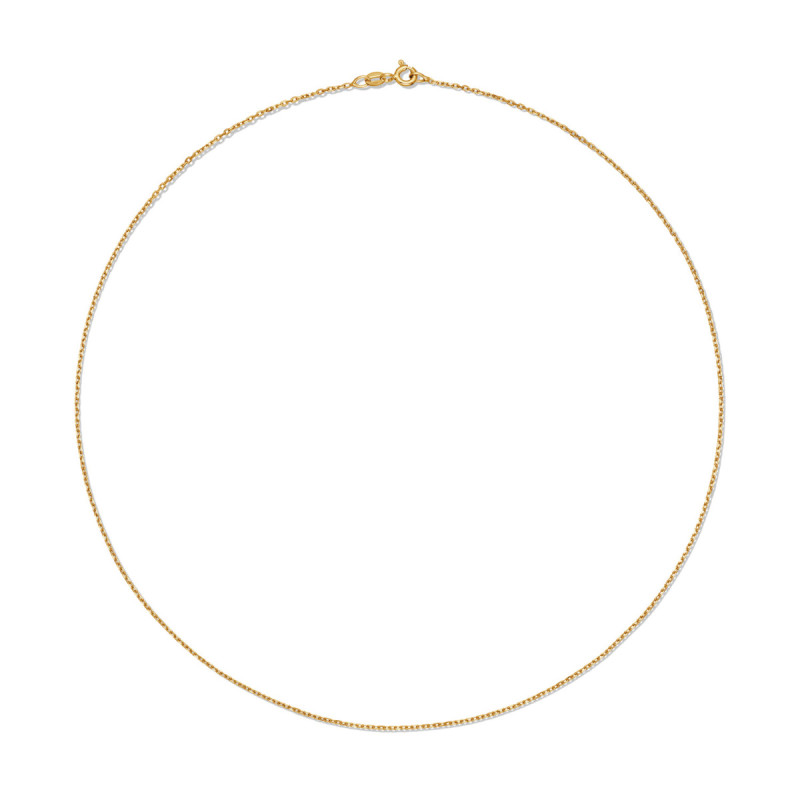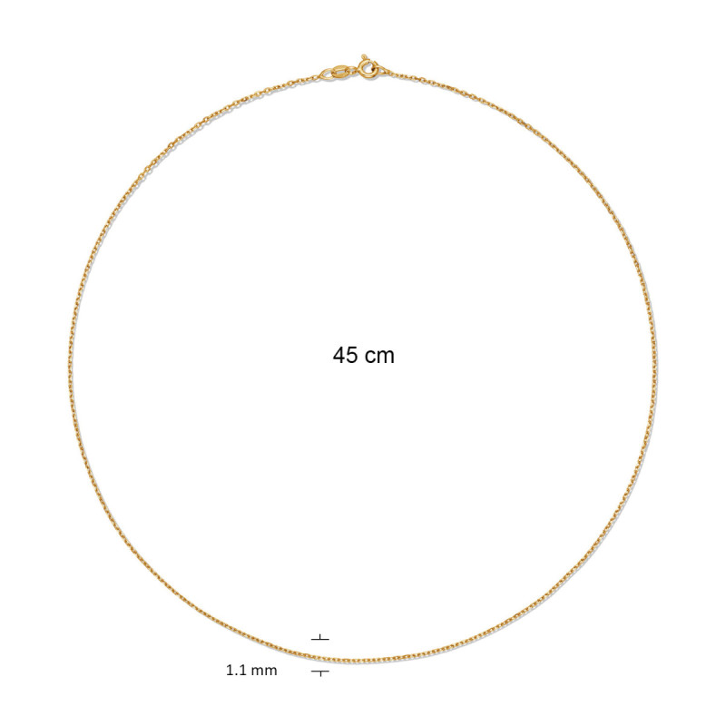 De ketting is vervaardigd uit 14-karaat goud en valt soepel om de hals. De veerringsluiting zorgt ervoor dat de ketting makkelijk en veilig te sluiten is. Met een lengte van 45 cm en een breedte van 1.1 mm biedt deze ketting flexibiliteit om hem op meerdere manieren te dragen, bijvoorbeeld als een ketting voor hanger(s) of zonder hanger.