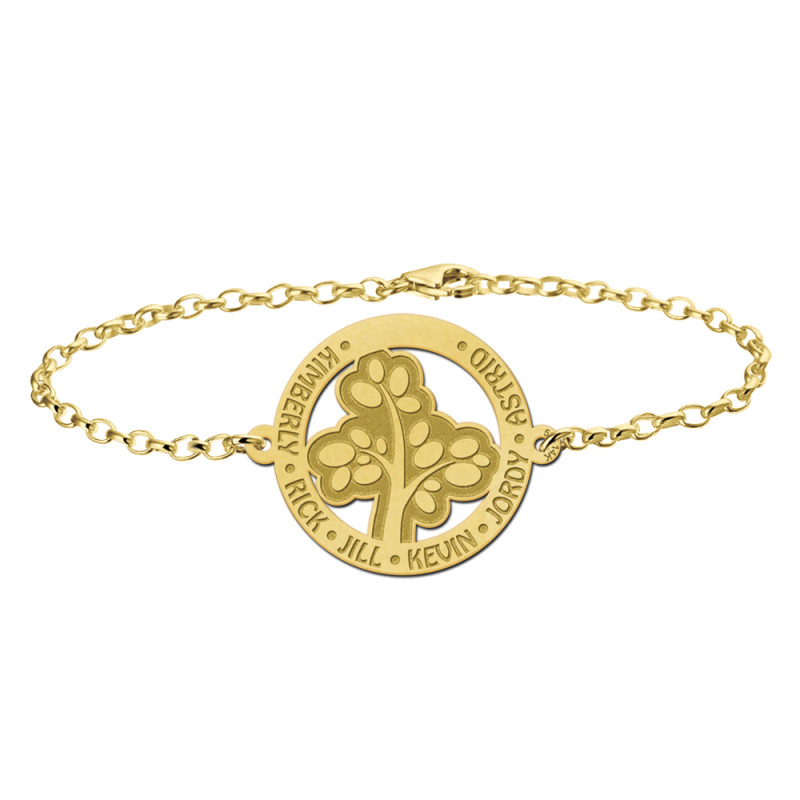 Gepersonaliseerde armbanden zijn de trend van dit moment! Deze 14-karaat gouden armband mag dan ook niet ontbreken in uw sieradencollectie. De armband is uitgevoerd met een fraaie levensboom als centraal punt, welke gepersonaliseerd kan worden met in de rand gravures van meerdere namen. Het plaatje is 0.4 mm mm dik en heeft een diameter van 19.5 mm. De armband heeft een lengte van 17 -20 cm en is uitgevoerd met een jasseron schakel. Verras uzelf of iemand die speciaal voor u is met deze prachtige gepersonaliseerde armband. Levering inclusief mooi sieradendoosje.