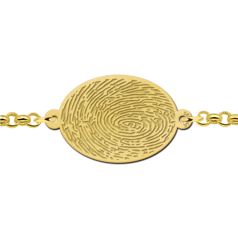 Op zoek naar een betekenisvolle gouden armband? Dan is deze gouden armband met vingerafdruk in de vorm van een ovaal een prachtig sieraad. Zo draagt u uw geliefde altijd bij u. De armband is verkrijgbaar in een verstelbare lengte van 17 tot 20 cm. Door de open schakels is elke armband makkelijk in lengte te verstellen. Het gouden ovaaltje heeft een grootte van 18.5 mm bij 13.5 mm en is 0.4 mm dik. Echt 14-karaat goud. Inclusief sieradendoosje. Let op: deze armband wordt speciaal voor u gemakat. Hierdoor bedraagt de levertijd circa 5 werkdagen en kan de armband niet worden geruild of geretourneerd!