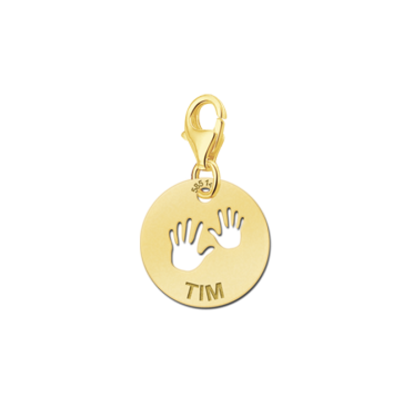 Deze prachtige gouden bedel met handjes kan gemaakt worden met elke naam die u wenst. Zo kunt u altijd laten zien wie u liefhebt! De bedel heeft een diameter van 14 mm en is gemaakt van echt 14-karaats goud. Door zijn subtiele formaat en karabijnhanger is geschikt voor aan een armband. De bijpassende gouden armband is los verkrijgbaar. Let op: doordat wij deze bedel speciaal voor u maken, bedraagt de levertijd circa 5 werkdagen. Daarnaast kunnen gepersonaliseerde sieraden niet worden geretourneerd.