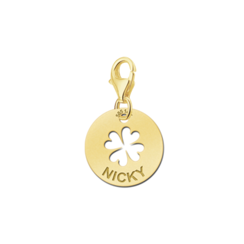 Deze prachtige gouden bedel met klavertje kan gemaakt worden met elke naam die u wenst. Zo kunt u altijd laten zien wie u liefhebt! De bedel heeft een diameter van 14 mm en is gemaakt van echt 14-karaats goud. Door zijn subtiele formaat en karabijnhanger is hij geschikt voor aan een armband. De bijpassende gouden armband is los verkrijgbaar. Let op: doordat wij deze bedel speciaal voor u maken, bedraagt de levertijd circa 5 werkdagen. Daarnaast kunnen gepersonaliseerde sieraden niet worden geretourneerd.
