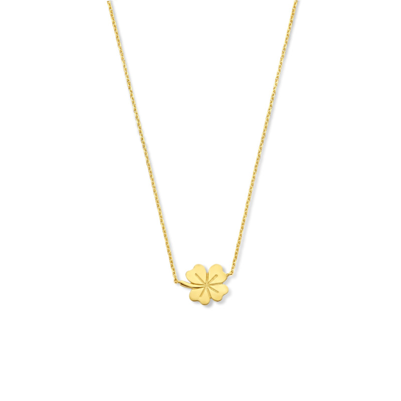 Een 14-karaat gouden ketting uitgevoerd met een klavertje vier. Het klavertje vier staat voor geluk. De gouden anker ketting is 0.8 mm breed en is draagbaar op de lengtes 40, 42 en 44 cm. Het klavertje vier is 8 mm hoog en 10.5 mm breed. De ketting is gepolijst en heeft hierdoor een mooie glanzende afwerking.