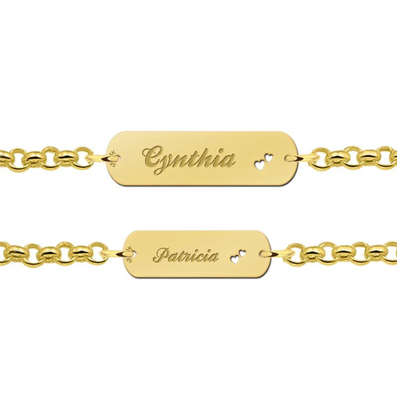 Deze prachtige set moeder en dochter armbanden zijn volledig gemaakt van 14-karaat goud. De armbanden symboliseren de bijzondere band tussen moeder en dochter. Op beide armbanden is er plek voor één naam van maximaal 10 tekens. Naast de naam bevinden zich twee open hartjes. De armbanden zijn draagbaar tussen de 17 cm en 20 cm. Het plaatje met de naam is 0.4 mm dik. Het ene naamplaatje is iets groter dan het andere naamplaatje. Ook verkrijgbaar in hoogwaardig zilver.