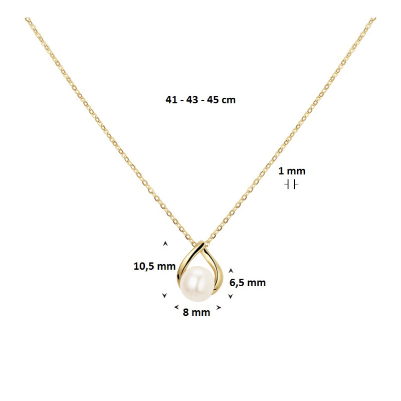 Klassieke gouden parelketting met een witte zoetwaterparel van 6.5 mm groot. De ketting heeft een minimalistische maar sierlijke look, die mooi past bij veel gelegenheden. Voorzien van een mooie gouden ankerschakel van 1 mm dik en drie draaglengtes: 41, 43 en 45 cm. De hanger is in totaal 10.5 mm (hoogte) bij 8.2 mm (breedte) groot. De ketting wordt verstuurd een een mooi sieradendoosje.