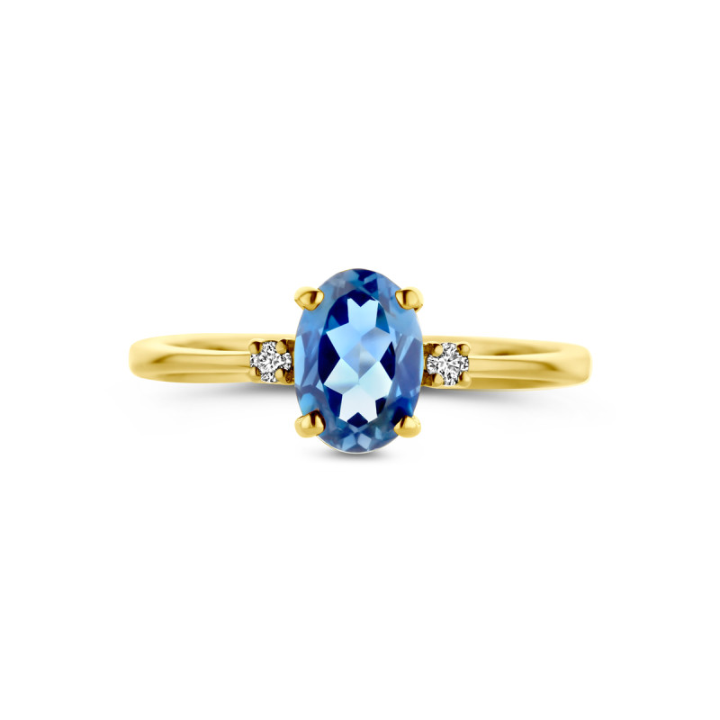 Gouden ring met ovale London blue topaas en diamanten van 0.04 crt