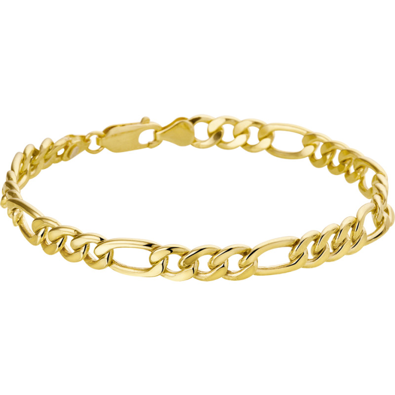Deze gouden armband is gemaakt van 14-karaats goud en vervaardigd met sierlijke figaroschakels. Door de zilveren kern is de armband massief en goed bestand tegen stoten. Middels de karabijnsluiting kunt u de armband gemakkelijk om- en afdoen. De armband is 21 cm lang en 7 mm breed.
