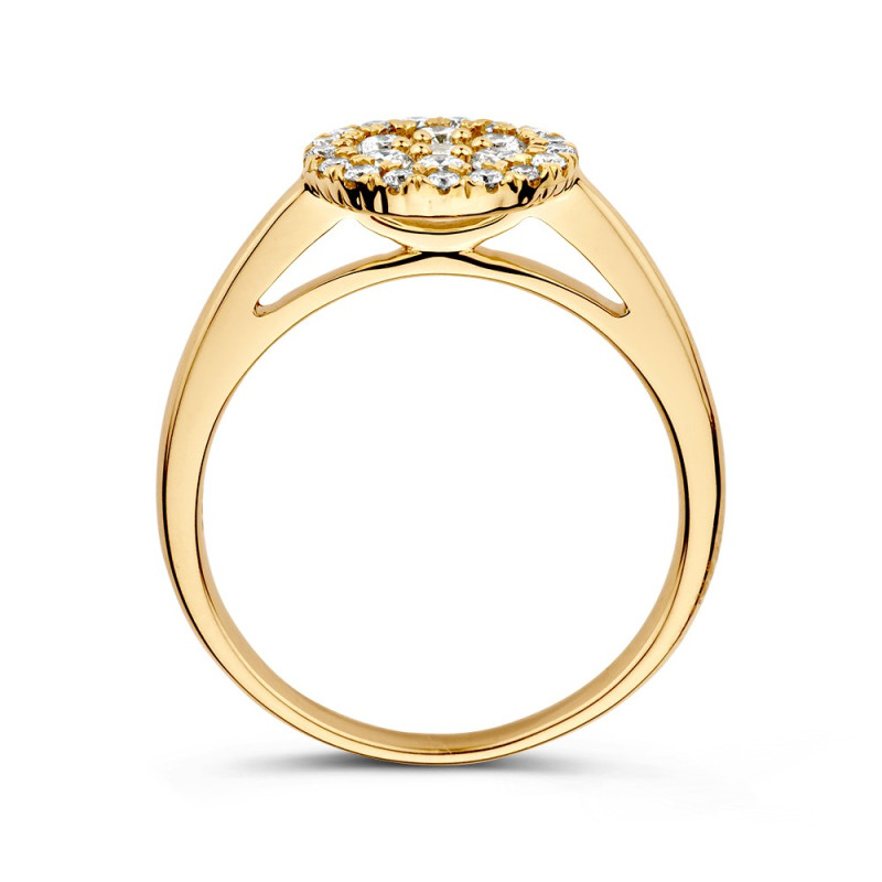 Ervaar de tijdloze elegantie van deze prachtige halo-ring, een echte eye-catcher. Met een breedte van 9.7 mm is deze ring een opvallend sieraad dat perfect is voor de moderne vrouw die houdt van stijl en klasse. De ring is vervaardigd uit hoogwaardig 14-karaat goud, wat zorgt voor een luxueuze uitstraling en een duurzame kwaliteit. De glanzende afwerking van het goud versterkt de schittering van de diamanten, waardoor het geheel een sprankelende uitstraling heeft.
