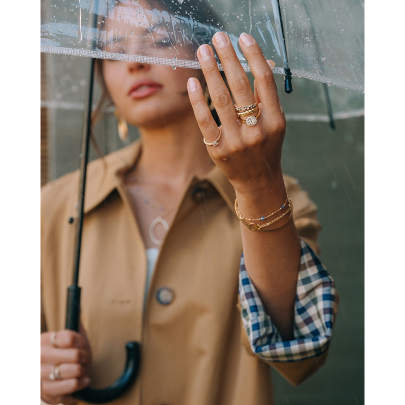 Het middelpunt van deze ring is een ronde vorm gezet met diamanten, met een totaal gewicht van 0.60 crt. De diamanten zijn zorgvuldig geselecteerd op basis van zijn uitstekende H-kleurgraad en SI1-zuiverheid, waardoor ze een heldere en sprankelende uitstraling hebben. Deze entourage ring is een symbool van verfijnde smaak en is perfect voor speciale gelegenheden of als een dagelijks sieraad dat elke outfit compleet maakt.
