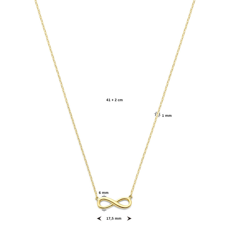 Deze infinity ketting van goud is niet alleen prachtig om te zien, maar heeft ook een mooie betekenis. Het infinity teken, ook wel oneindigheid teken genoemd, staat symbool voor de eeuwigheid. Zo is deze ketting een prachtig sieraad om cadeau te geven aan een geliefde en zo te laten zien hoeveel zij voor u betekent. De ketting wordt bovendien geleverd in een mooie geschenkverpakking, zodat het meteen klaar is om cadeau te doen. De ketting heeft een dikte van 1 mm en kan gedragen worden op 2 verschillende lengtes: 41 en 43 cm. De infinity hanger is 17.5 mm breed en 6 mm hoog. Ketting en hanger zijn beide gemaakt van echt 14-karaat goud.