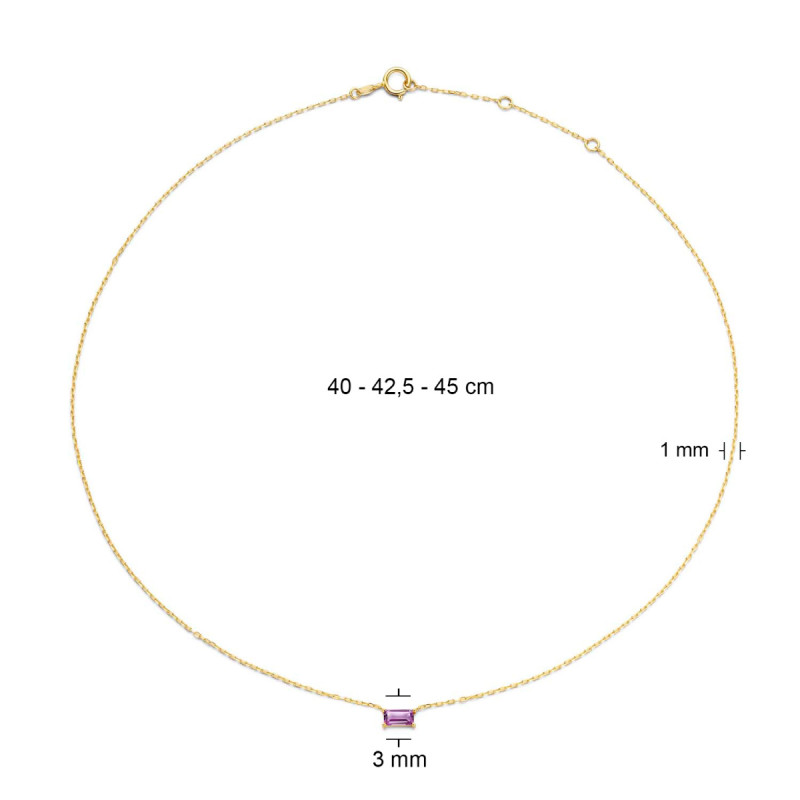 Deze schakelketting is gemaakt van 14-karaat geelgoud en voorzien van een natuurlijke, paarse amethiststeen. Deze paarse amethist heeft een breedte van 4 mm en geeft het collier een stijlvolle uitstraling. De ketting van ankerschakel met een breedte van 1 mm heeft een verstelbare lengte, door de extra oogjes is het eenvoudig op de gewenste lengte aan te passen op 40, 42,5 en 45 cm. Het sluit met een veerringsluiting.