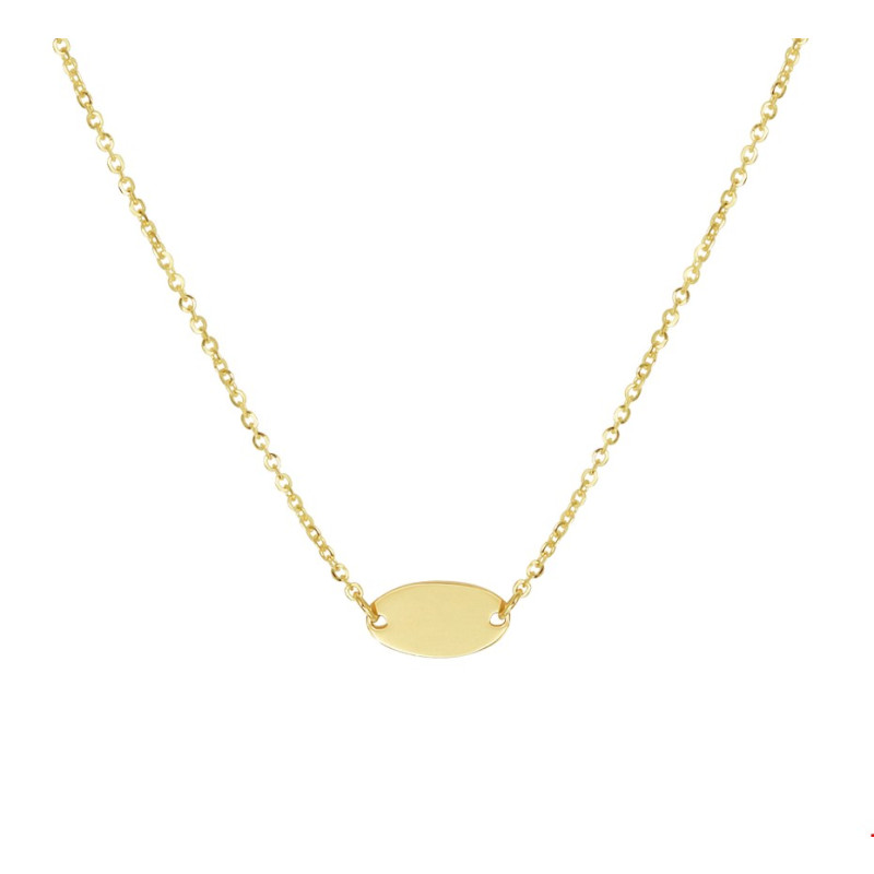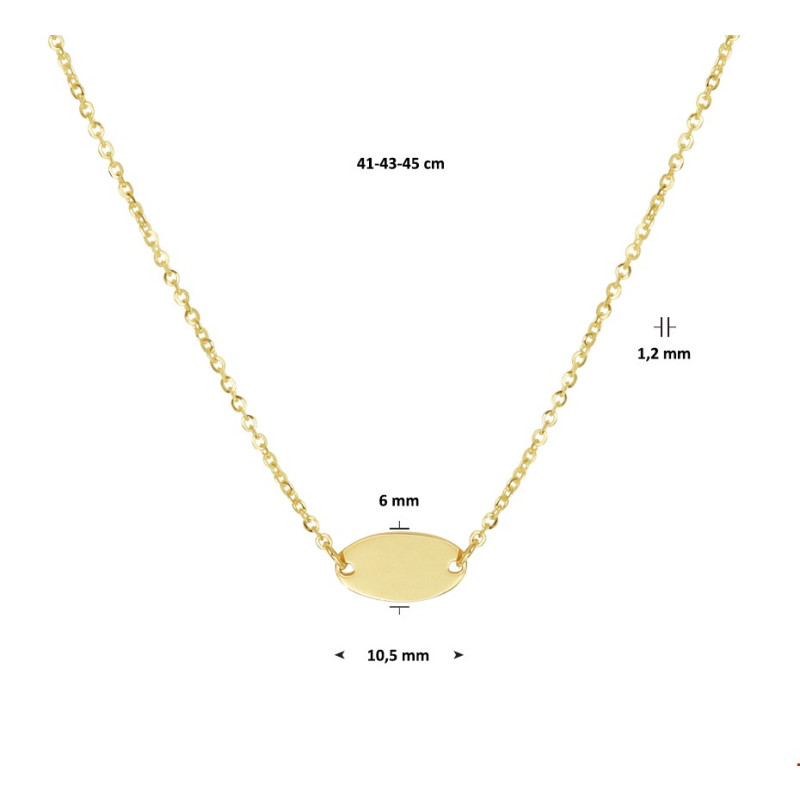 Gouden ketting met eenvoudig ovaal plaatje (10.5 mm x 6 mm). Deze gouden ketting heeft een variabele draaglengte van 41-43-45 cm. De ketting is circa 1 mm breed. Het gebruikte goud heeft een gehalte van 14-karaat. Mostert Juweliers streeft naar een levertijd van 1-3 werkdagen. Onze sieraden leveren wij in een passende sieradendoos.