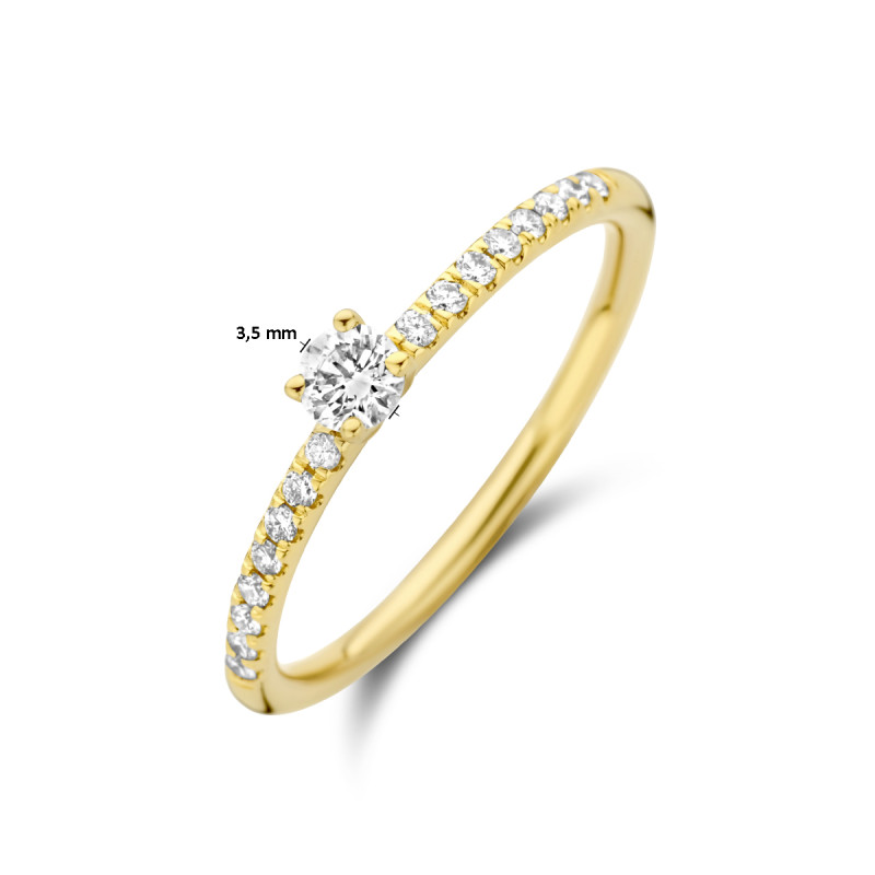 Wat betreft breedte heeft deze ring een mooie afmeting van 3.5 mm. Hiermee worden precies de juiste punten van de ring benadrukt en komt het ontwerp op de mooiste manier uit. De steengrootte is 3.5 mm en bepaalt voor het merendeel het prachtige karakter van deze ring.