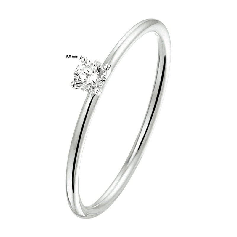 Schitterende 14-karaat witgouden ring met een diamant en een legering van palladium. De diamant is 3 mm groot en heeft een zuiverheid van SI2. De diamant is briljant geslepen heeft een transparante kleur en heeft een gewicht van 0.1crt. De perfecte ring om je geliefde mee te verassen! Verkrijgbaar in diverse maten van 16.00 mm t/m 18.50 mm. De ring wort geleverd in een luxe sieradendoosje.