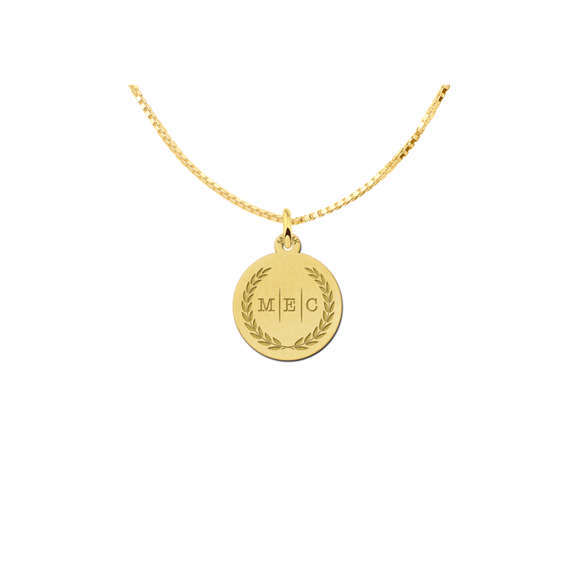 Ons nieuwe design staat in het teken van succes. Deze schitterende gouden hanger met lauwerkrans kan gepersonaliseerd worden drie initialen naar keuze. Perfect voor als je op zoek bent naar een sieraad waarbij je je dierbare bij je draagt. De hanger heeft een diameter van 15 mm is gepolijst en glanzend afgewerkt. Combineer de hanger met een bijpassende gouden ketting naar keuze voor een complete sieradenlook.