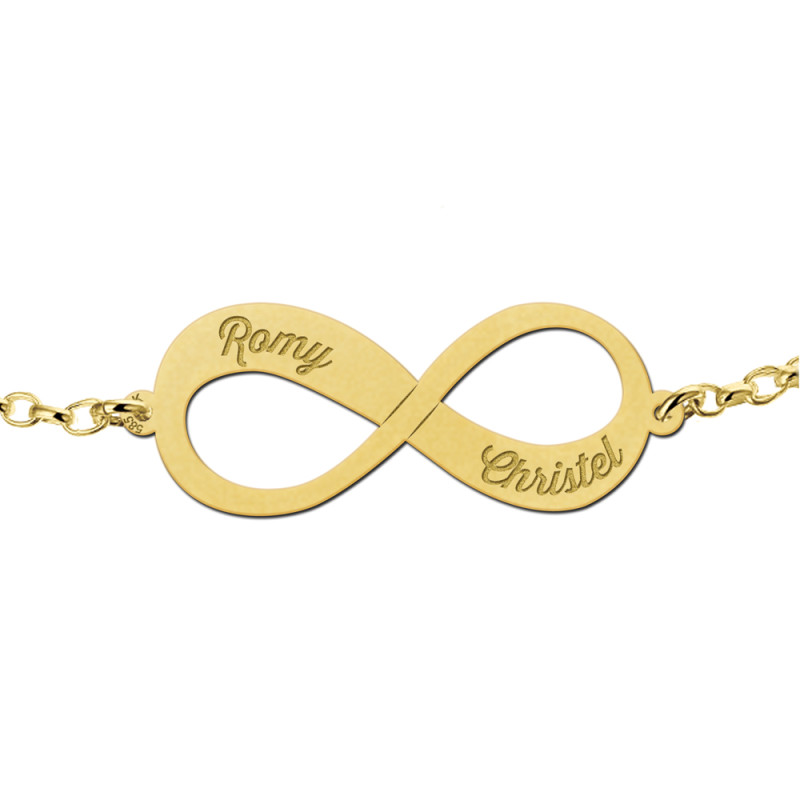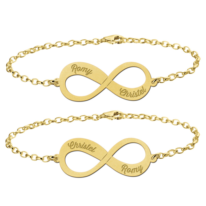 Twee gouden jasseron armbanden met in het midden het infinity teken welke gepersonaliseerd kan worden met twee namen. Eén armbandvoor jou en één armband voor mij een ideaal cadeau voor moeder en dochter of voor je beste vriendin. Het symbool is 34 mm x 15 mm groot en heeft een dikte van 0.4 mm. De armband heeft een lengte van 17 - 20 cm (verstelbaar). Levering inclusief luxe sieradendoosje. Welke namen ga jij op deze mooie armbanden laten graveren?