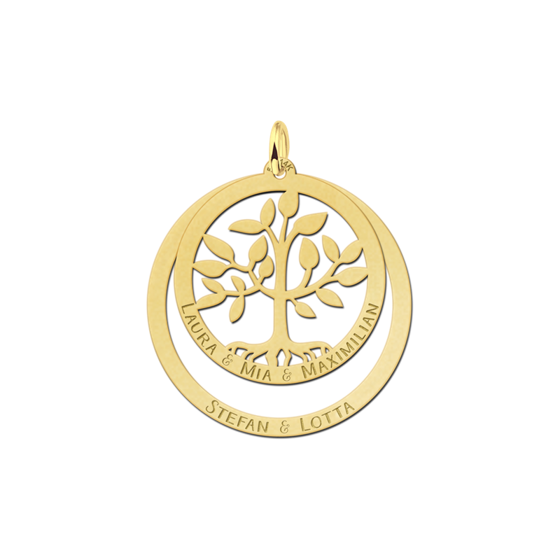 Een mooie gouden familie hanger met levensboom. De hanger bestaat uit twee delen. De grootste cirkel heeft een diameter van 30 mm. Hierop kunnen twee namen op worden gegraveerd. De cirkel met levensboom heeft een diameter van 24 mm en ook hierop kunnen namen of een teskt worden gegraveerd. Zo personaliseer je je hanger en wordt het een uniek sieraad. In totaal kunnen er 35 tekens in de kleine cirkel en 50 leestekens in de grote cirkel. De hanger wordt verpakt in een mooi sieradendoosje.