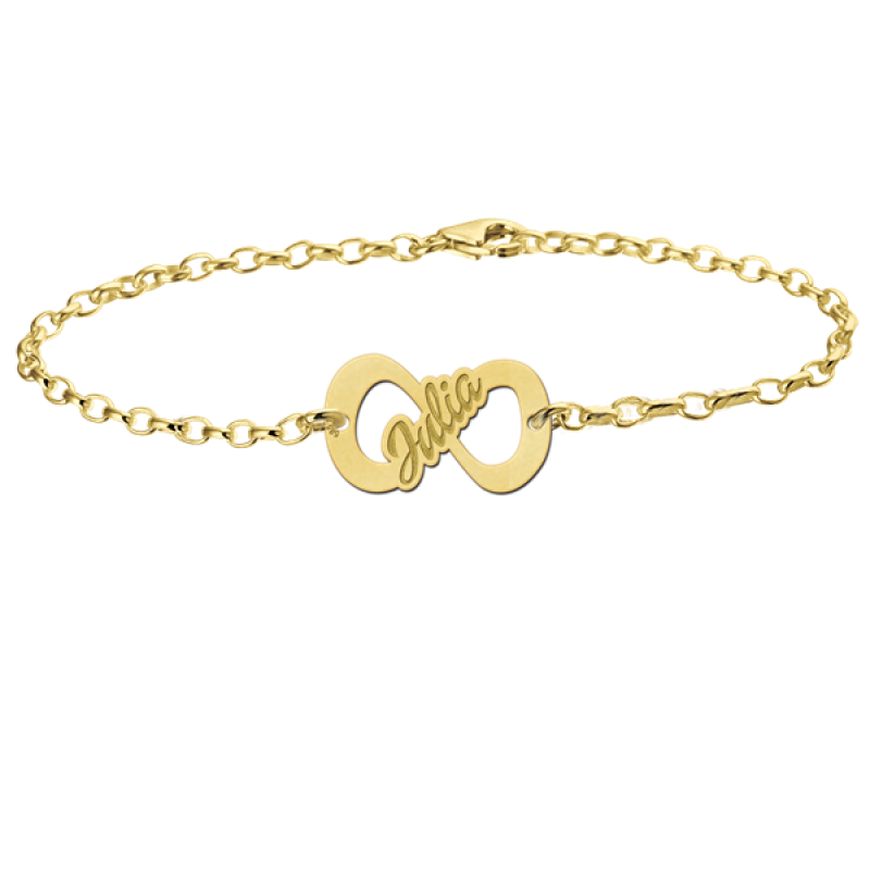 Bent u op zoek naar een gouden armband met een echte betekenis? Dan is deze gouden infinity armband zeker wat u zoekt. Het infinity teken is namelijk een symbool voor de eeuwigheid. Zo is deze armband een prachtig persoonlijk sieraad, waarmee u laat zien hoeveel die ene speciale persoon voor u betekent. De mooie uitgesneden naam maakt deze armband helemaal af. Het infinity teken heeft een grootte van 20 mm x 13 mm en is 0.6 mm dik. De armband kan besteld worden in drie verschillende lengtes: 16 cm, 18 cm en 21 cm. Door de open schakels is elke armband in lengte te verstellen. Echt 14-karaat goud.