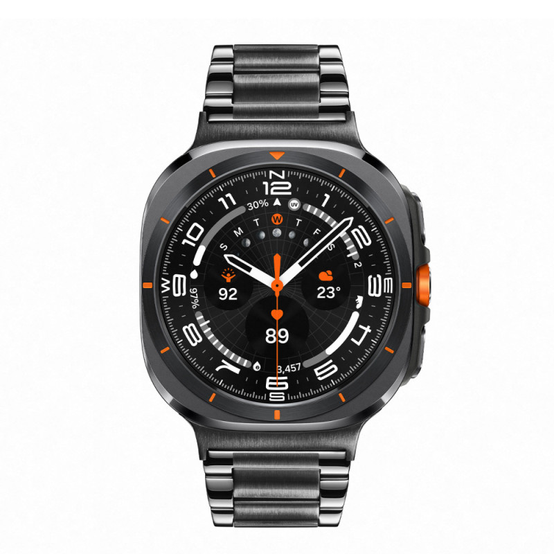 De Samsung Galaxy Watch Ultra SA.L705GUBS.L64 horloge is ontworpen voor veelzijdig gebruik, zowel dagelijks als sportief. Het biedt een solide constructie met een vierkante, titanium kast in grijs en een zwarte stalen schakelband die stevig om de pols zit.
