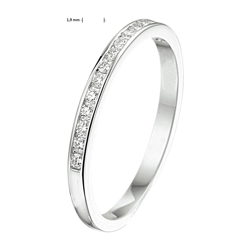 Prachtige ring met diamanten gemaakt van 14-karaat witgoud en palladium. De diamanten hebben een totaalgewicht van 0.15 crt en zijn mooi transparant van kleur. De ring is verkrijgbaar in maar liefst 7 maten (16.00 mm t/m 19.00 mm) en wordt geleverd inclusief sieradendoosje.