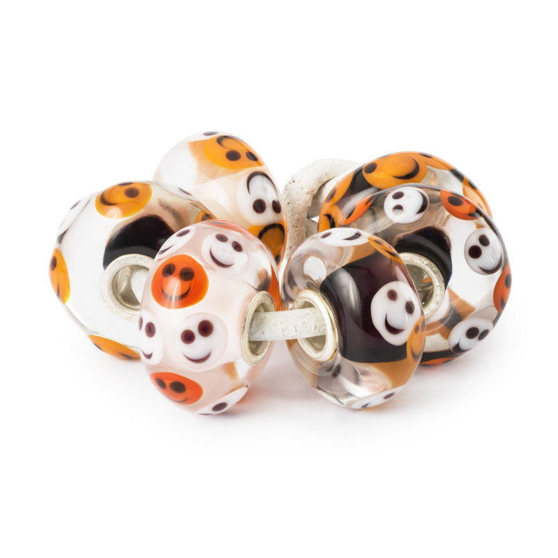 Vier Halloween met deze Trollbeads TGLBE-00244 Gelukkige gezinnen kralenset met smileys. Deze prachtige kralenset is een perfecte manier om je dierbare momenten met vrienden en familie te vieren. De set bestaat uit kralen van hoogwaardig 925 zilver en kleurrijk glas, met een gewicht van 11,7 gram. De vrolijke smileys in wit, oranje, bruin en roze brengen een glimlach op je gezicht en herinneren je aan de mooie momenten in het leven.