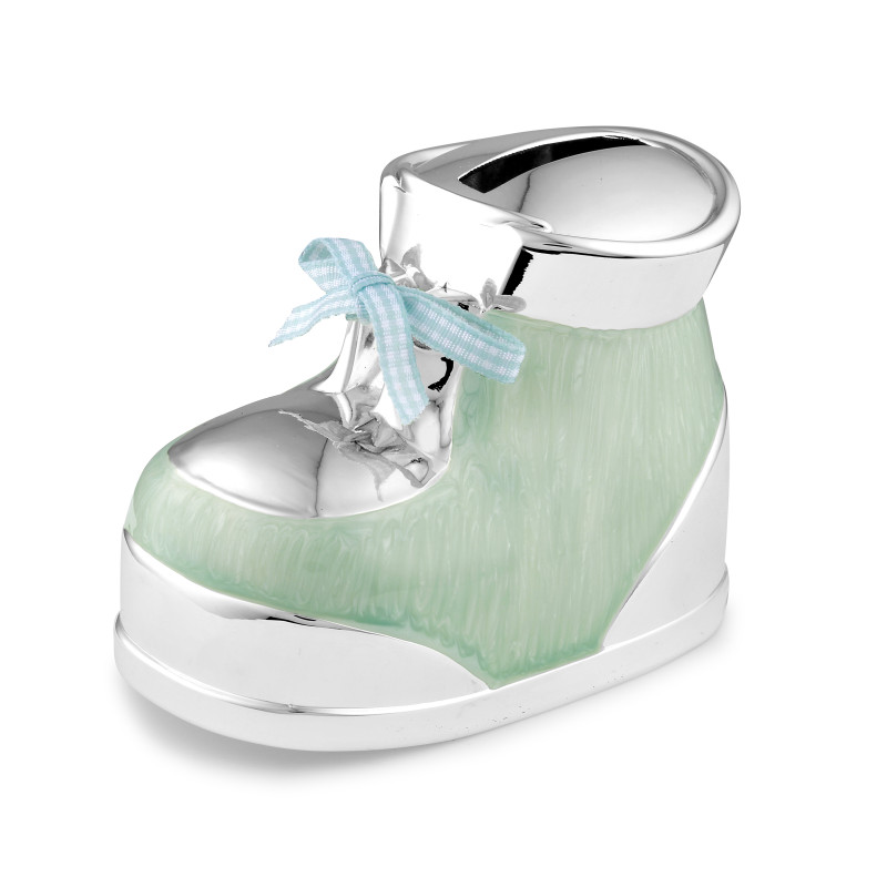 Een schattige verzilverde spaarpot in de vorm van een baby schoen gedecoreerd met groen/blauwe lak. Leuk voor op de babykamer en voor de kleine om zijn eerste zakcentjes in te doen Mooi idee als kraamcadeau
