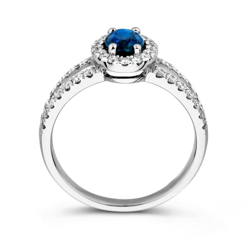 Mooie witgouden diamanten ring met een ovale blauwe saffier als middensteen in een diamanten entourage setting. Ook de ring zelf is met prachtige diamanten ingezet. De diamanten hebben een totaal karaatgewicht van 0.50 crt en de saffier is 1.02 crt. De prachtige diamanten en saffier in het midden zijn 10 mm breed en de ring zelf is circa 2.1 mm breed. Het witgoud heeft een 14-karaat gehalte. De ring wordt inclusief sieradendoosje geleverd.