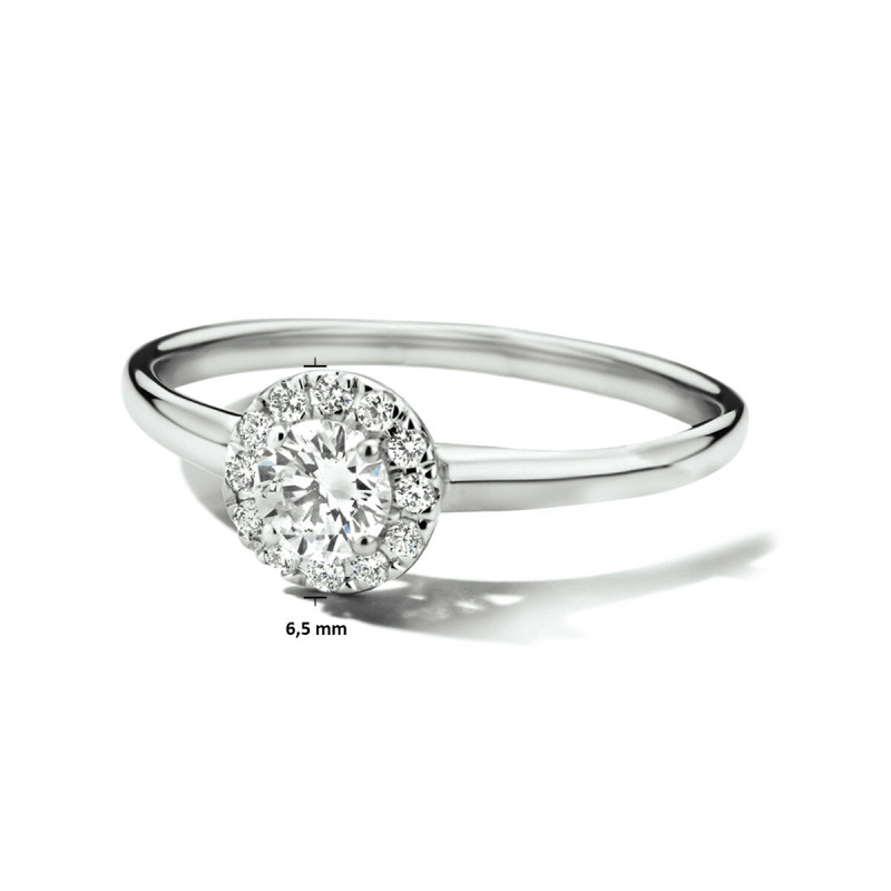 Mooie witgouden ring met een made diamond. Een made diamond is een diamant die door mensen gemaakt is (ofwel een synthetische diamant) die dezelfde eigenschappen heeft als een diamant uit de natuur. Zo doet de kwaliteit en schoonheid van deze steen zeker niet onder. De diamanten hebben in totaal een 0.33 karaat gewicht en hebben een SI-zuiverheid. De kleurgraad is H. Deze ring is gemaakt van witgoud met palladium en is verkrijgbaar in diverse maten. Levering inclusief sieradendoosje en indien gewenst in een mooie geschenkverpakking.