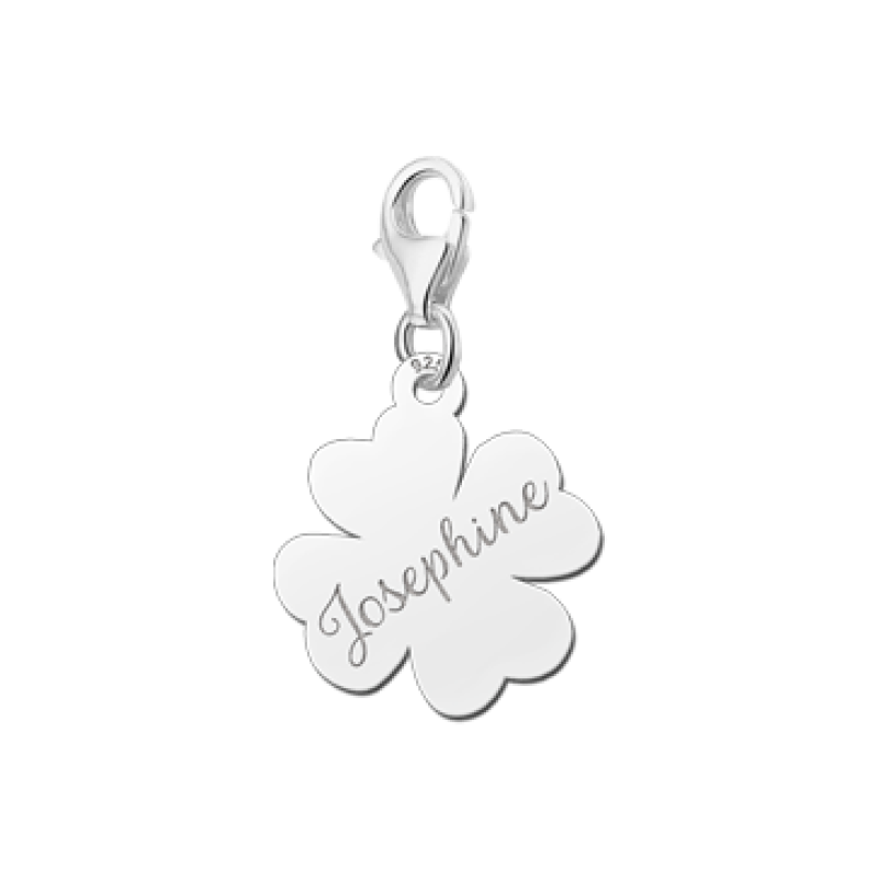 Deze prachtige zilveren bedel met klavertje kan gemaakt worden met elke naam die u wenst. Zo kunt u altijd laten zien wie u liefhebt! De bedel heeft formaat van 15 mm x 15 mm en is gemaakt van echt 925 Sterling zilver. Door zijn subtiele formaat en karabijnhanger is hij geschikt voor aan een armband. De bijpassende zilveren armband is los verkrijgbaar. Let op: doordat wij deze bedel speciaal voor u maken, bedraagt de levertijd circa 5 werkdagen. Daarnaast kunnen gepersonaliseerde sieraden niet worden geretourneerd.