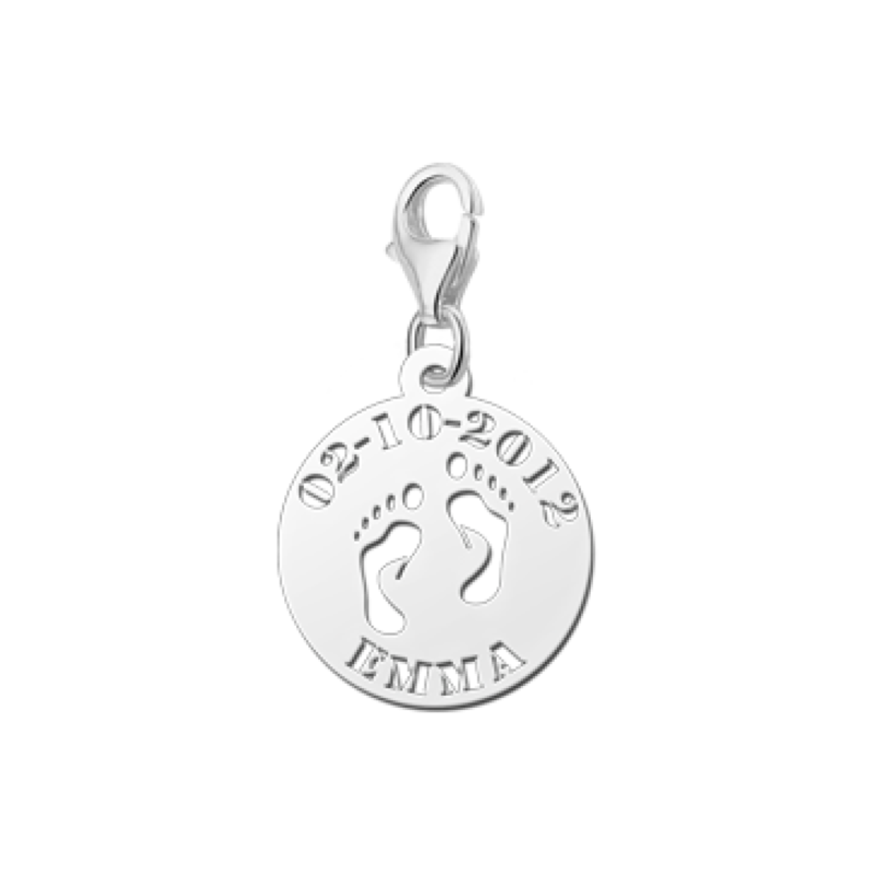 Deze prachtige zilveren bedel met babyvoetjes kan gemaakt worden met elke naam en datum die u wenst. Zo kunt u altijd laten zien wie u liefhebt! De bedel heeft een diameter van 16 mm en is gemaakt van echt 925 Sterling zilver. Door zijn subtiele formaat en karabijnhanger is hij geschikt voor aan een armband. De bijpassende zilveren armband is los verkrijgbaar. Let op: doordat wij deze bedel speciaal voor u maken, bedraagt de levertijd circa 5 werkdagen. Daarnaast kunnen gepersonaliseerde sieraden niet worden geretourneerd.