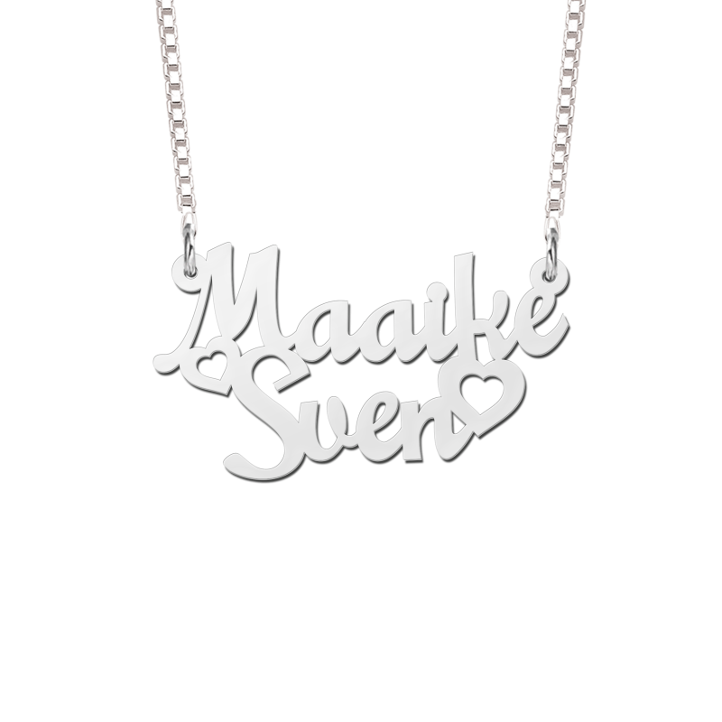 Deze zilveren dubbele naamketting is bijzonder doordat de namen zijn verbonden met twee hartjes. Dit geeft aan dat jullie door liefde zijn verbonden. De voorbeeldnamen bij deze naamketting zijn Maaike en Sven. Deze zilveren dubbele naamketting wordt geleverd met een zilveren venetiaanse ketting van 42 cm. De breede/dikte van de ketting is ongeveer 1.1 mm.