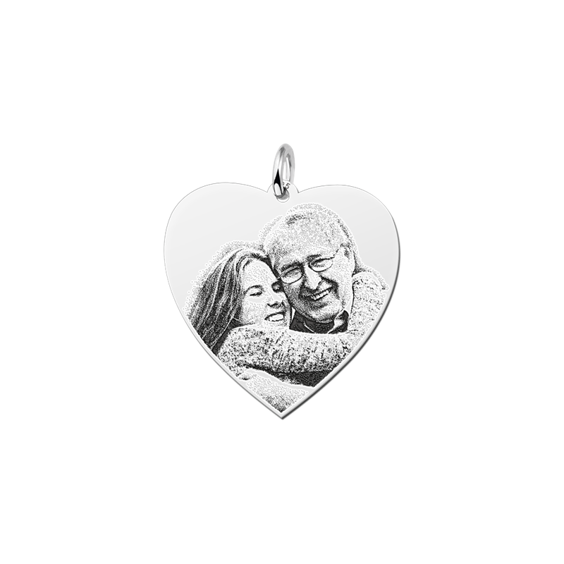Prachtige zilveren foto hanger in de vorm van een hart. Gemaakt van de hoogste kwaliteit 925 Sterling zilver. Op de hartjes hanger graveren wij de foto die u ons aanlevert. Wij zorgen ervoor dat de foto prachtig op de zilveren hartjes hanger gegraveerd wordt. Het hartje heeft een afmeting van ongeveer 26.5 bij 26.5 mm en een dikte van 0.7 mm. Eventueel is het hartje ook beschikbaar in 14-karaat goud. Bekijk daarnaast ook eens de overige beschikbare foto hangers zoals de ronde, rechthoekige, vierkante of ovalen foto hangers.
