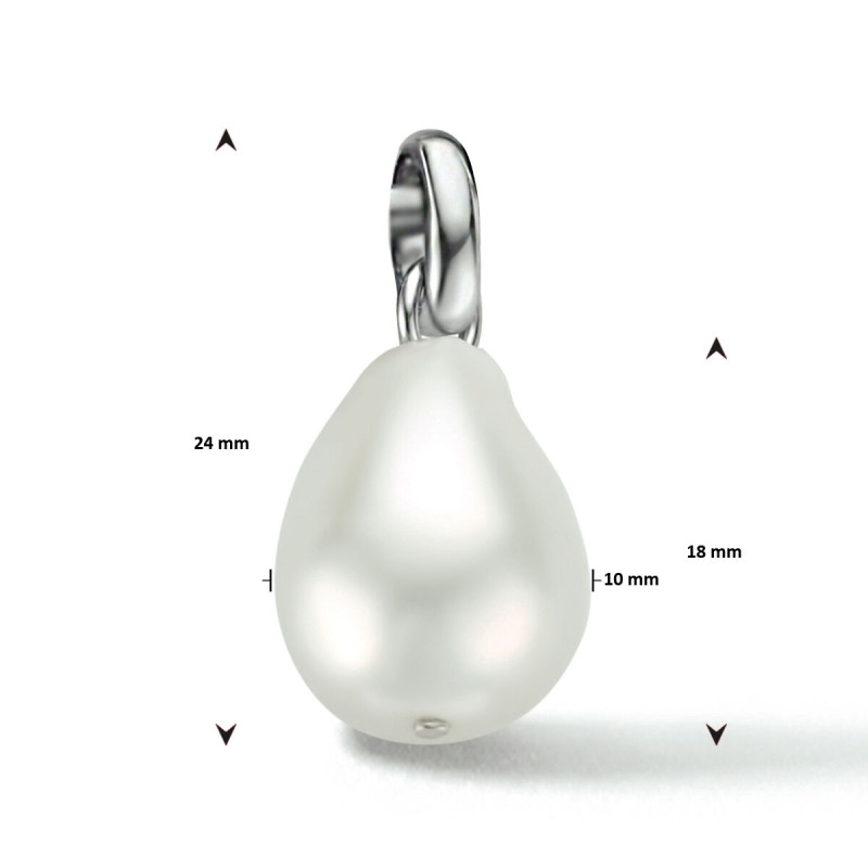 Mooie zilveren hanger met een witte zoetwaterparel van 10 mm breed bij 18 mm hoog. De parel heeft een natuurlijke look doordat hij niet precies rond is maar wat oneffenheden in de vorm vertoont. Zo is elke parel helemaal uniek en komt hij barok" over. Een mooie hanger met een totale hoogte van 24 mm (2.4 cm). De hanger is gemaakt van 925 gerhodineerd zilver en wordt inclusief sierdendoosje geleverd."