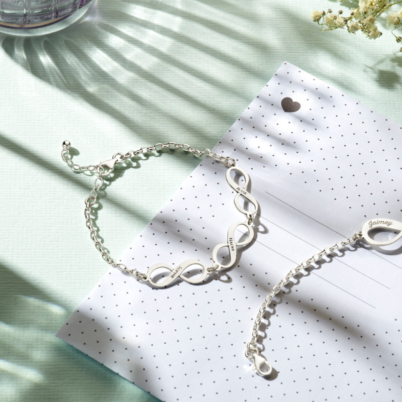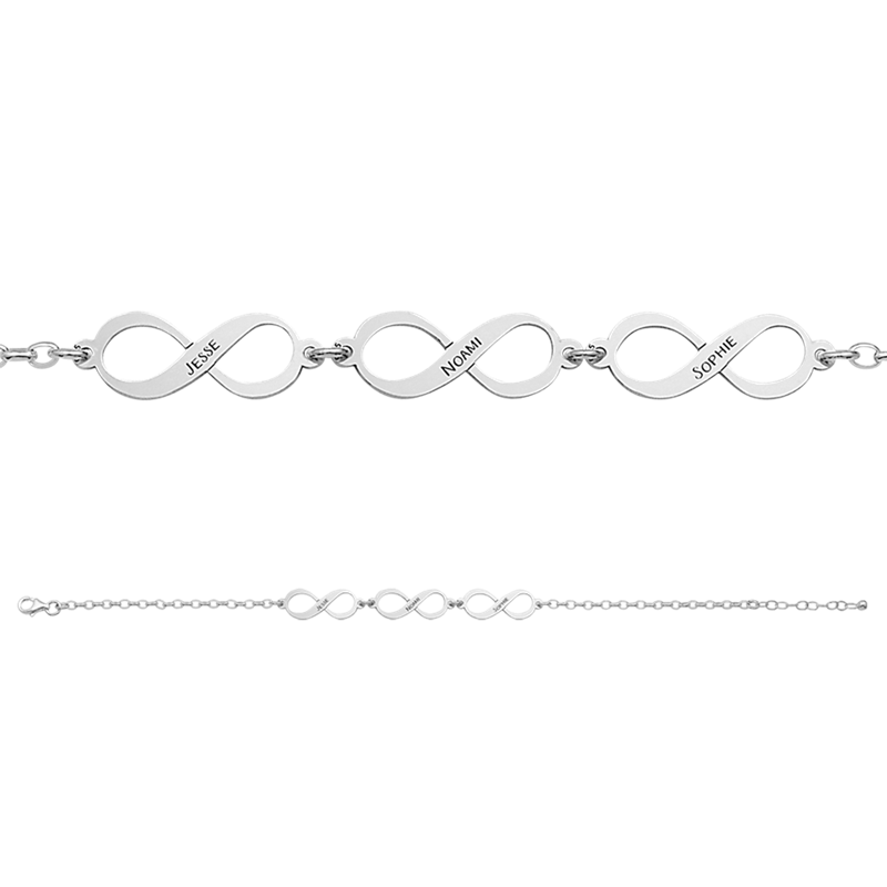 Op zoek naar een leuke infinity naamarmband? Dan is deze armband de perfecte keuze! De zilveren infinity armband is eenvoudig, maar toch opvallend. De armband kan gepersonaliseerd worden met drie namen van maximaal 12 tekens per naam. De infinity tekens zijn 20 mm lang, 8.5 mm hoog en 0.7 mm dik. De armband heeft een draaglengte van 17 - 20 cm en is volledig gemaakt van hoogwaardig 925 zilver. Levering inclusief mooi sieradendoosje.