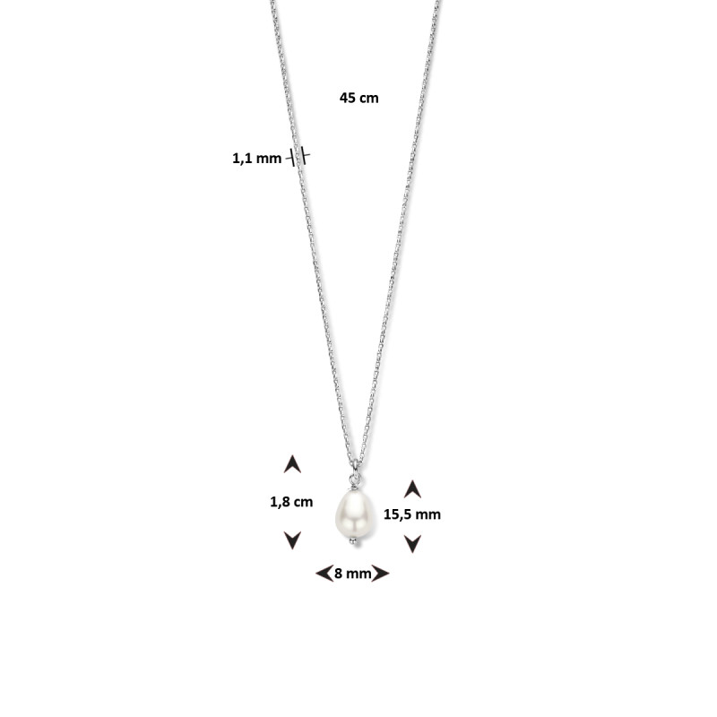 Prachtige simpele maar stijlvolle parelketting van zilver. De ketting heeft een draaglengte van 45 cm en is 1.1 mm breed. De parel heeft een hoogte van 15.5 mm en een breedte van 8 mm en heeft een mooie helderwitte kleur. Prachtig als u op zoek bent naar een ketting die klassiek is, maar tegelijkertijd erg trendy. Levering inclusief mooi sieradendoosje.