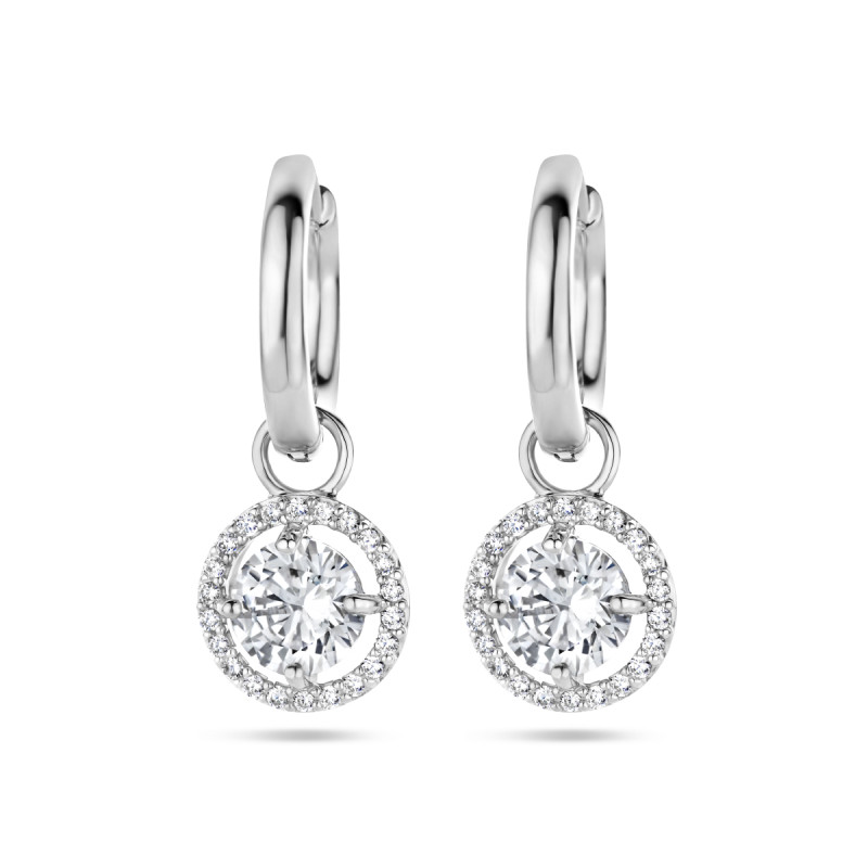 Zilveren klapcreolen met ronde zirkonia hanger - Diameter 14 mm
