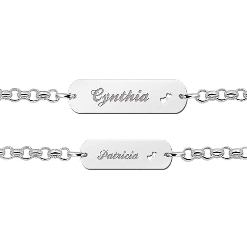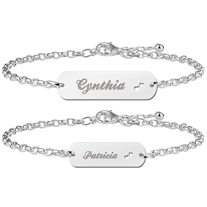 Deze prachtige set moeder en dochter armbanden zijn volledig gemaakt van hoogwaardig 925 zilver. De armbanden symboliseren de bijzondere band tussen moeder en dochter. Op beide armbanden is er plek voor één naam van maximaal 10 tekens. Naast de naam bevinden zich twee open hartjes. De armbanden zijn draagbaar tussen de 17 cm en 20 cm. Het plaatje met de naam is 0.7 mm dik. Het ene naamplaatje is iets groter dan het andere naamplaatje. Ook verkrijgbaar in 14-karaat geelgoud.