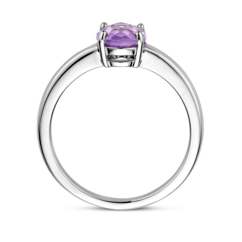 Een deel van het ringoppervlak is versierd met prachtige amethist. De steenkleur is paars en zal lang mooi helder blijven. De verschillende vormen waarin ruwe stenen geslepen kunnen worden zijn in de loop der eeuwen bovendien steeds verder ontwikkeld en geperfectioneerd. De slijpvorm die hier gekozen is (briolette) past prachtig bij de steensoort in deze ring.