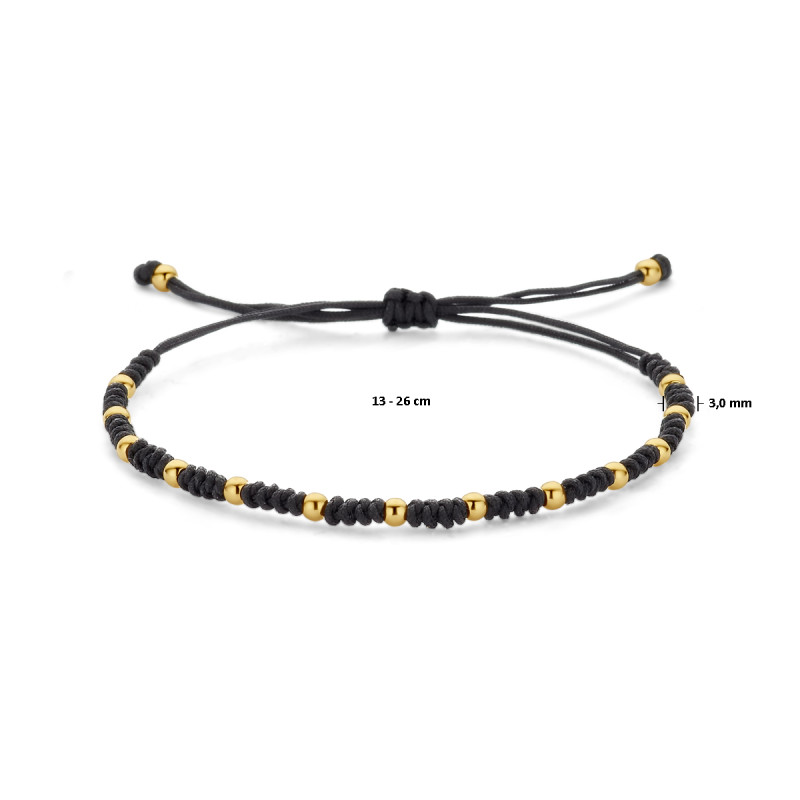 Deze koordarmband is een combinatie van stijl en kwaliteit. De armband is gemaakt van hoogwaardig 14-karaats goud en nylon, wat zorgt voor een aantrekkelijke combinatie van materialen. De gouden bolletjes zijn gelijkmatig verdeeld over de zwarte nylon koord, wat een interessant contrast oplevert. De glanzende afwerking van de gouden bolletjes zorgt voor een extra vleugje klasse.